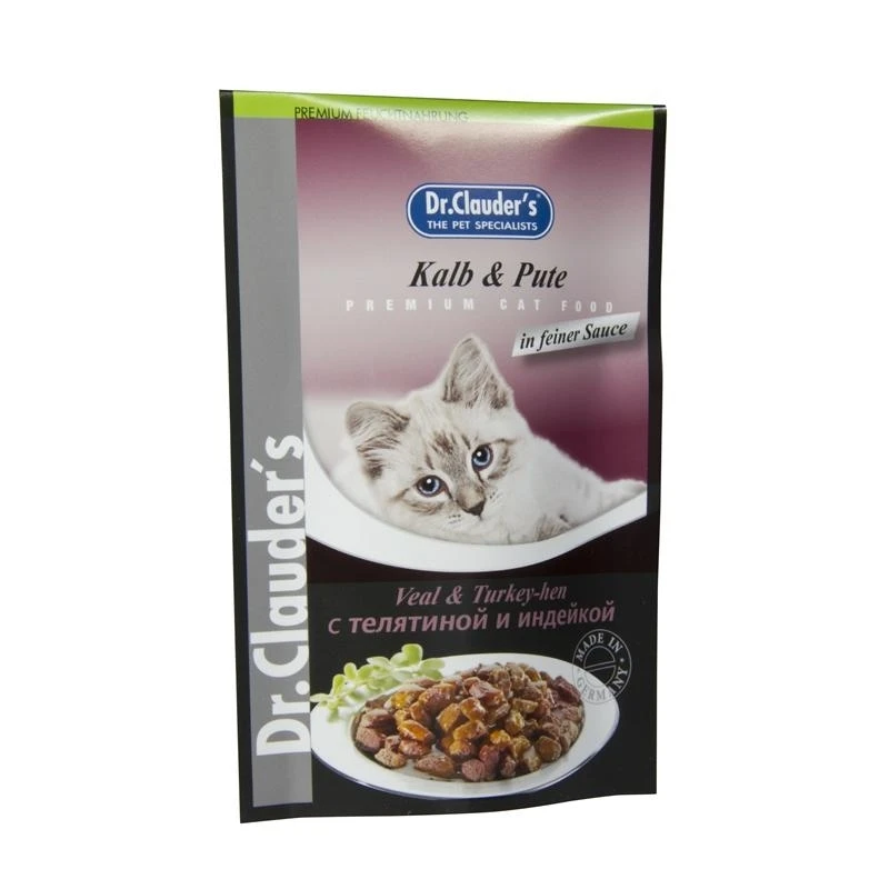 Dr. Clauders Premium Katzenfutter im Frischebeutel mit feinen Stückchen.
