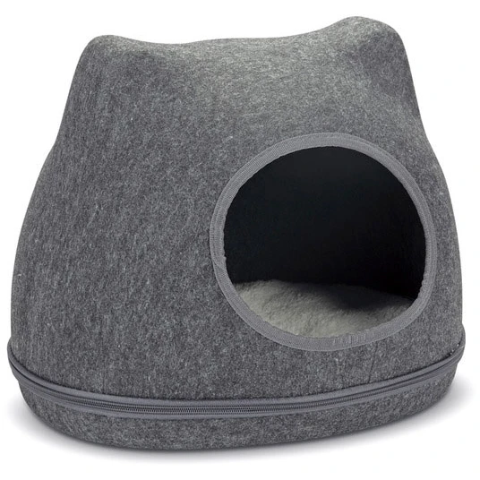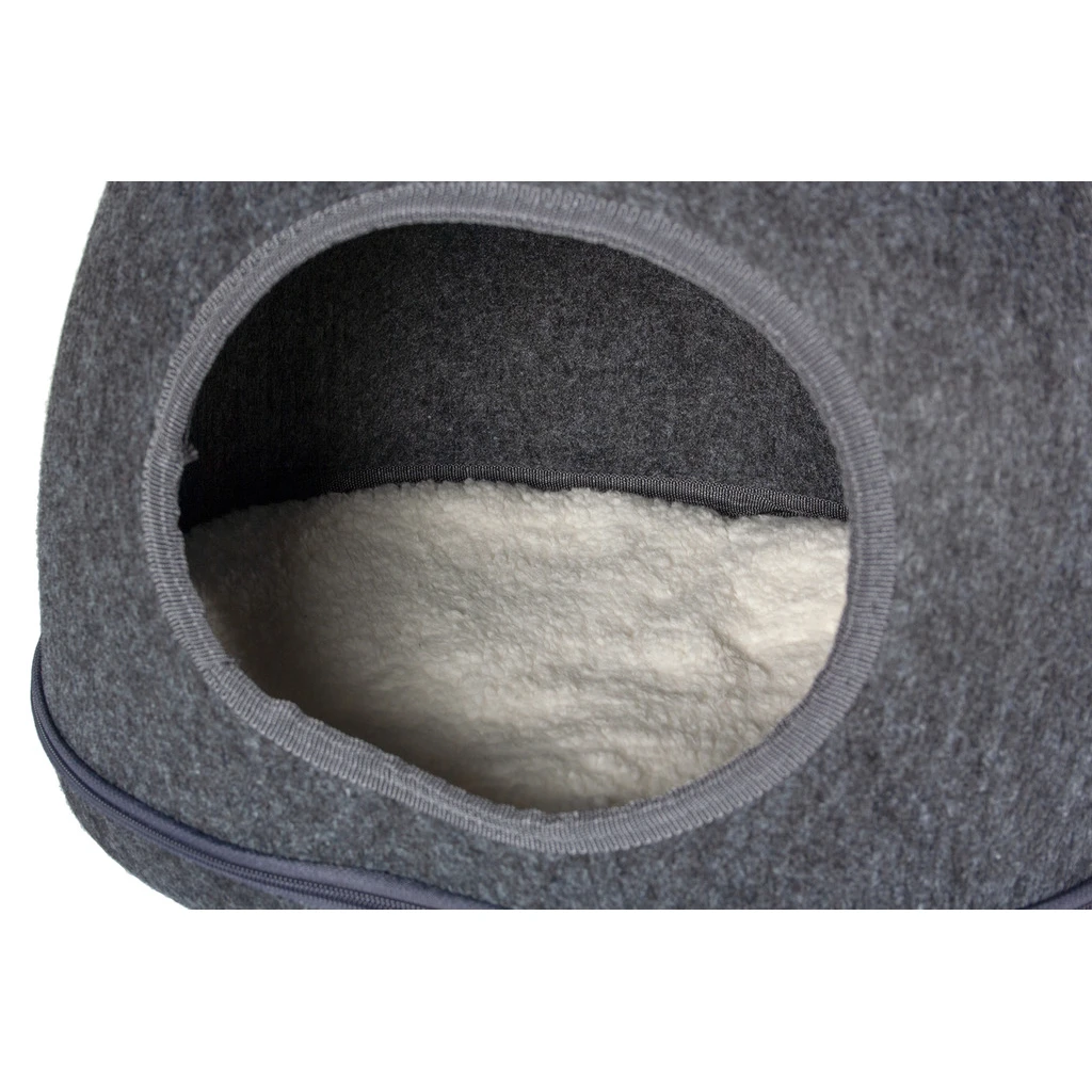 Katzen schlafen durchschnittlich 18 Stunden pro Tag vom tiefen Schlaf bis zum kleinen Nickerchen ist alles dabei. Da ist ein gemütlicher Schlafplatz natürlich sehr wichtig. Die Katzenhöhle Yupik bietet Katzen einen eigenen, abgedunkelten Raum, in dem sie friedlich schlafen können. Dank des Reißverschlusses kann der obere Teil abgenommen werden. Das kuschelige Plüschkissen im Inneren lässt sich herausnehmen und kann bei Bedarf in der Waschmaschine gereinigt werden (bei 30 Grad). Die Höhle ist aus Filz gearbeitet und in puristischem Grau gehalten. So entsteht ein wunderschöner Look, der sich harmonisch in jede Einrichtung einfügt. Die Form mit den angedeuteten Katzenohren gibt der Höhle Yupik einen verspielten Touch. Für alle, die es schlichter mögen, gibt es Varianten ohne dieses Detail.