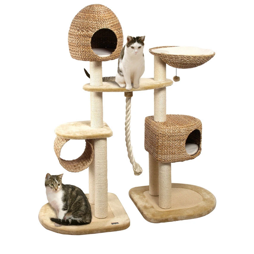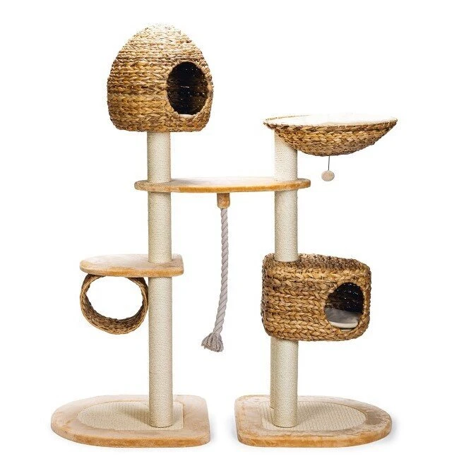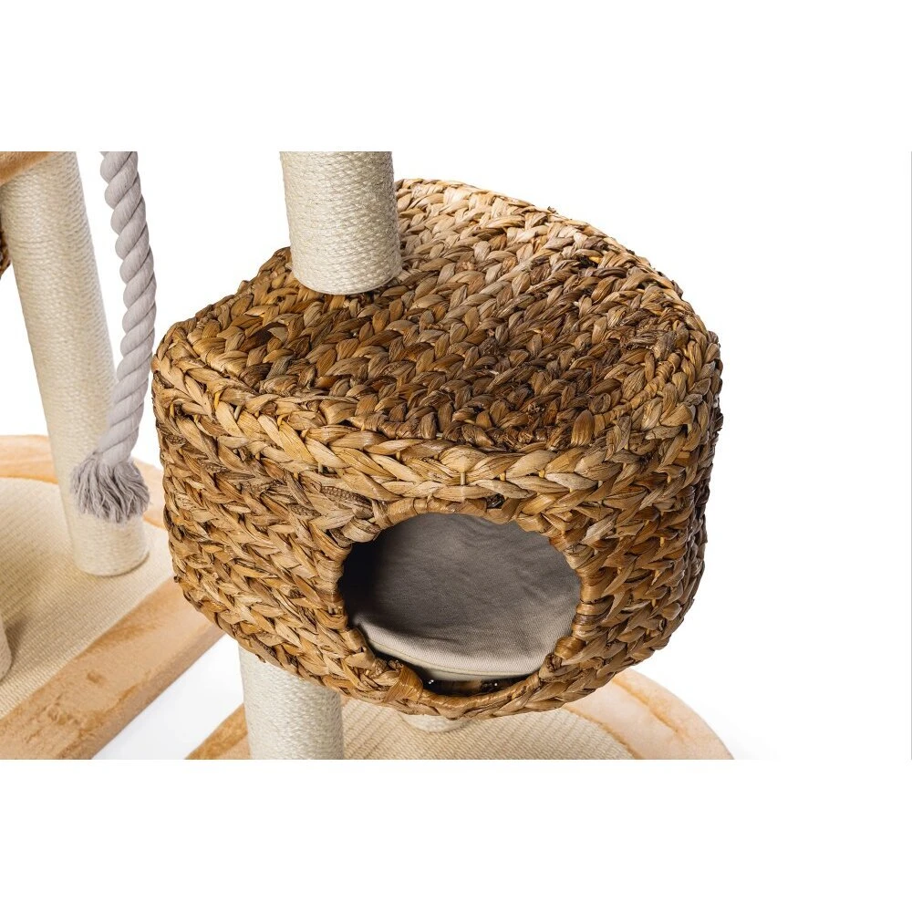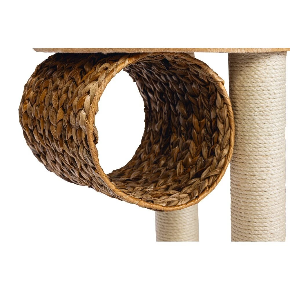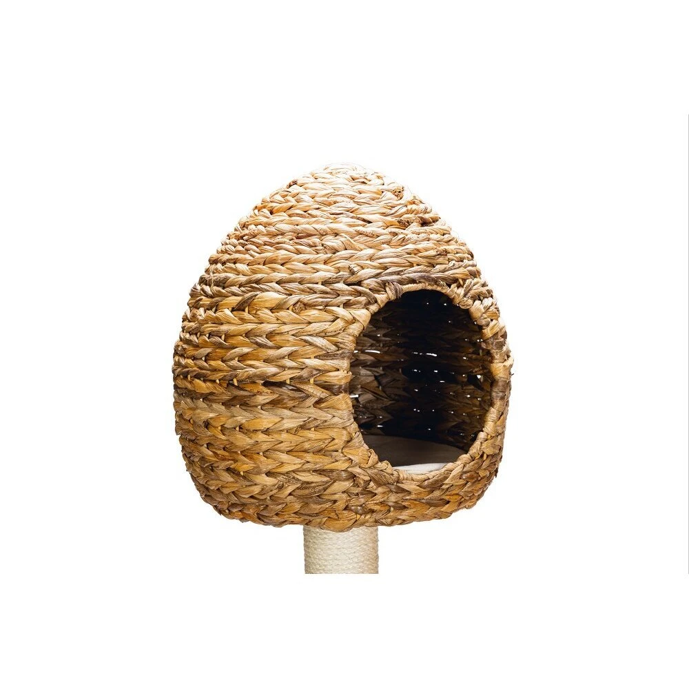 Der Kratzbaum Banana Leaf 4 zeichnet sich durch besonders robuste Verarbeitung von Sisal und handgeflochtenen Bananenblättern wird diese Kombination Ihnen und Ihrer Katze lange Freude bereiten. Genug Kratzmöglichkeiten gibt es durch vier mit Sisal umwickelte Säulen. Zwei kuschelige Höhlen und eine offene Rolle aus Banana Leaf laden ein zum Schlafen, Verstecken oder Ausruhen. Weitere Plattformen, ein herabhängendes Seil und ein Spielball lassen keine Langeweile aufkommen, diese Kratzbaumkombination bietet unendlichen Spiel- und Kletterspaß. Die Stämme haben einen Durchmesser von 9 cm.