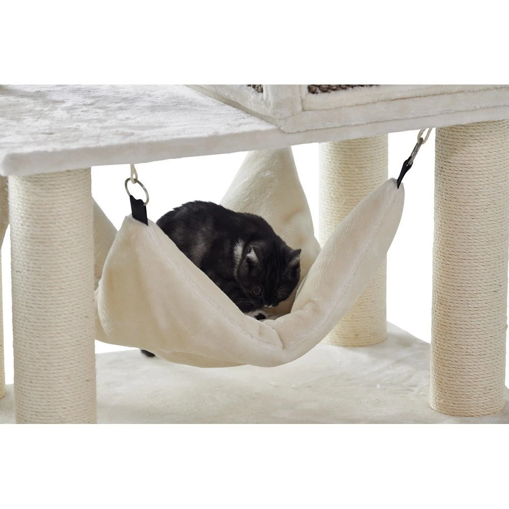 Kuschelige Liegemulden, eine große Platte mit Kissen, eine Höhle und Hängematten bieten gemütliche Rückzugsmöglichkeiten auch für große und schwere Katzen. Die Sisalstämme und die Höhle mit Sisalflächen sorgen für spielerische Abwechslung und die nötige Krallenpflege. Durch die Bodenplatte mit den Maßen 80 x 50 cm und die breiten Sisalstämme mit einem Durchmesser von 12 cm, wird ein stabiler Stand gesichert. Damit können sich ebenso größere Katzen auf dem Kratzbaum rekeln und wohlfühlen. Er hat eine Gesamthöhe von 166 cm.