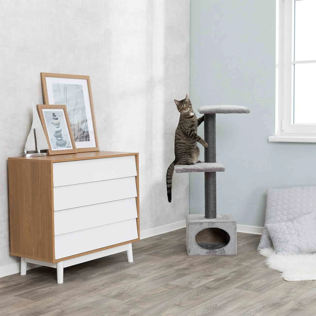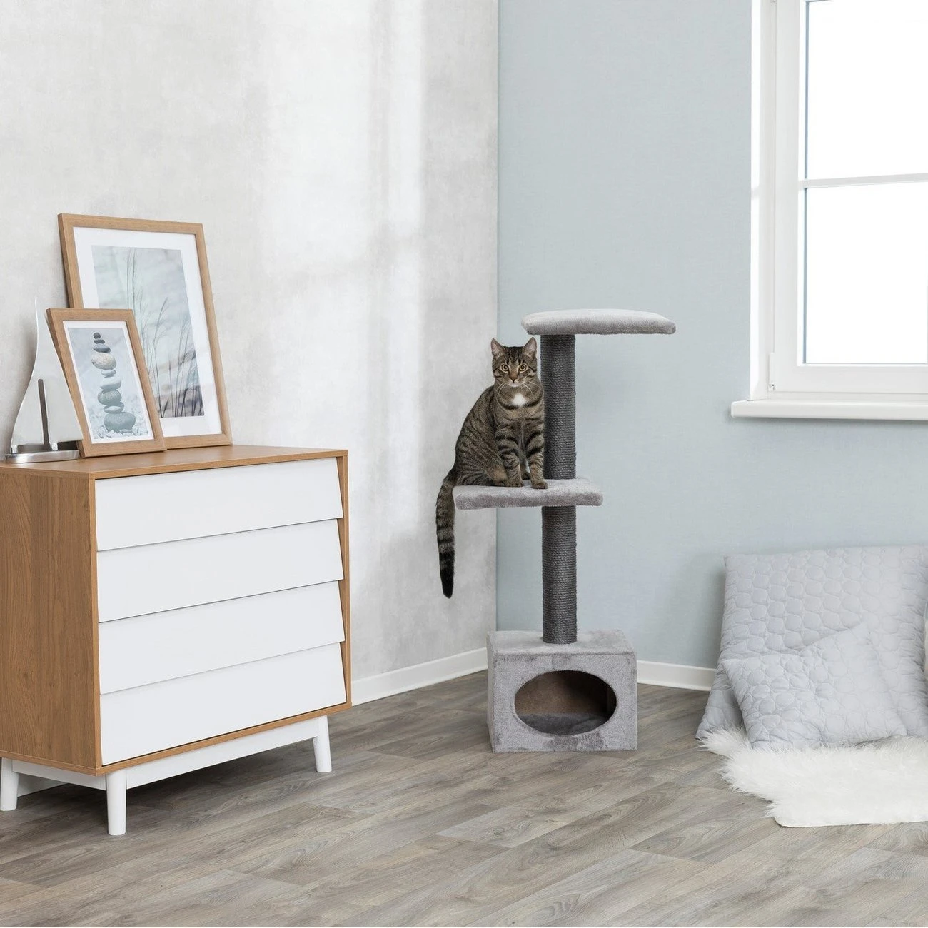 Der Trixie Kratzbaum Galeno in grau hat weichem Plüsch-Bezug.