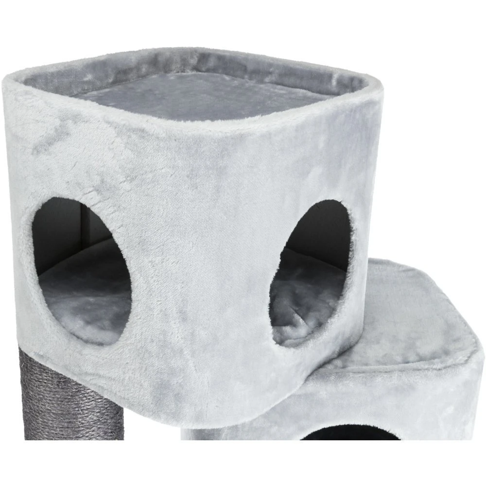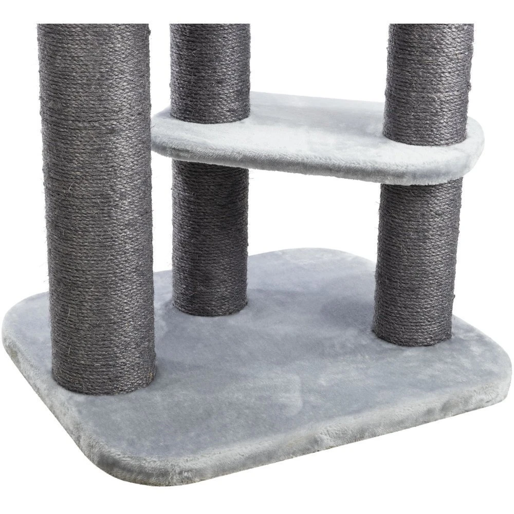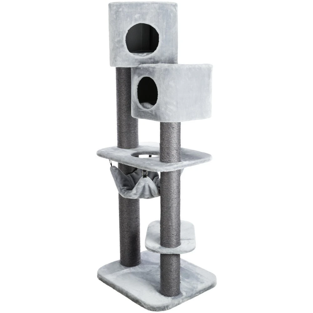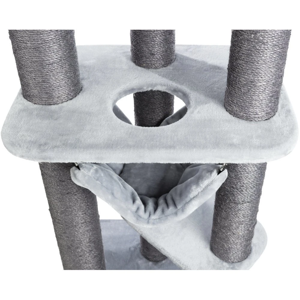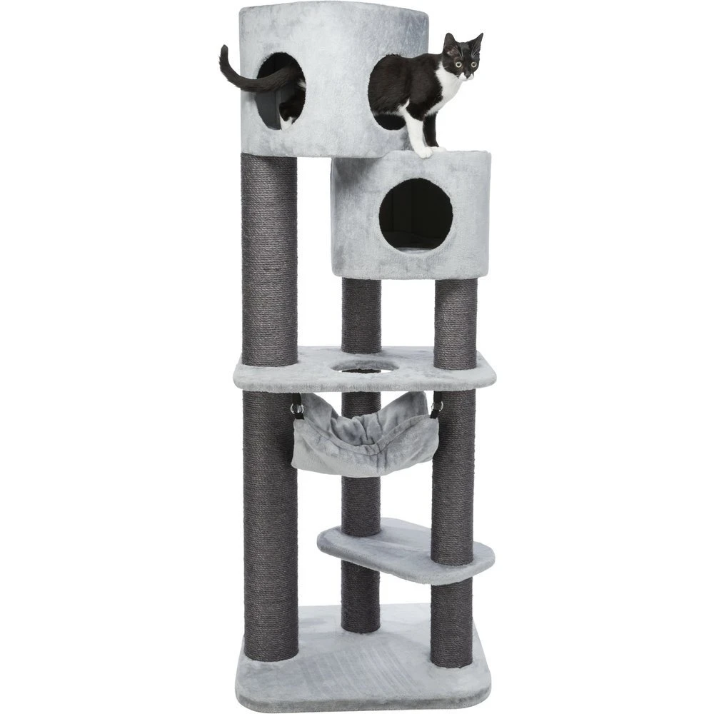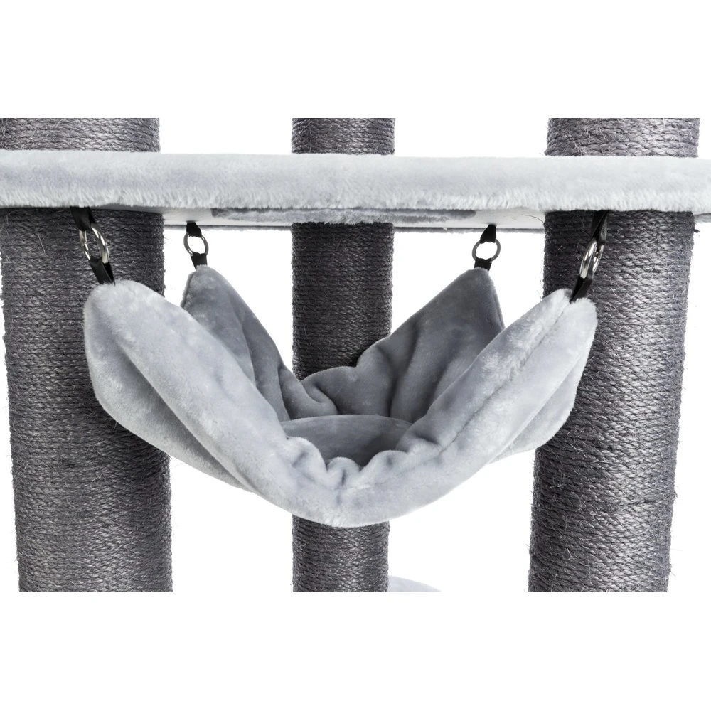 Dieser Kratzbaum von TRIXIE trägt den Namen „Pirro“ und ist ein wahres Spielparadies für Katzen und Kater. Der Kratzbaum verfügt über zwei Höhlen in die sich der Stubentiger entspannt zurückziehen kann, ohne den Überblick über sein Reich zu verlieren. Außerdem sorgt eine Hängematte für gemütliche Stunden zum entspannen. Die Stämme des Kratzbaumes sind allesamt mit Sisal umwickelt, damit der Kater oder die Katze sich ausgiebig um die eigene Krallenpflege kümmern kann und sich die Krallen daran wetzen kann.